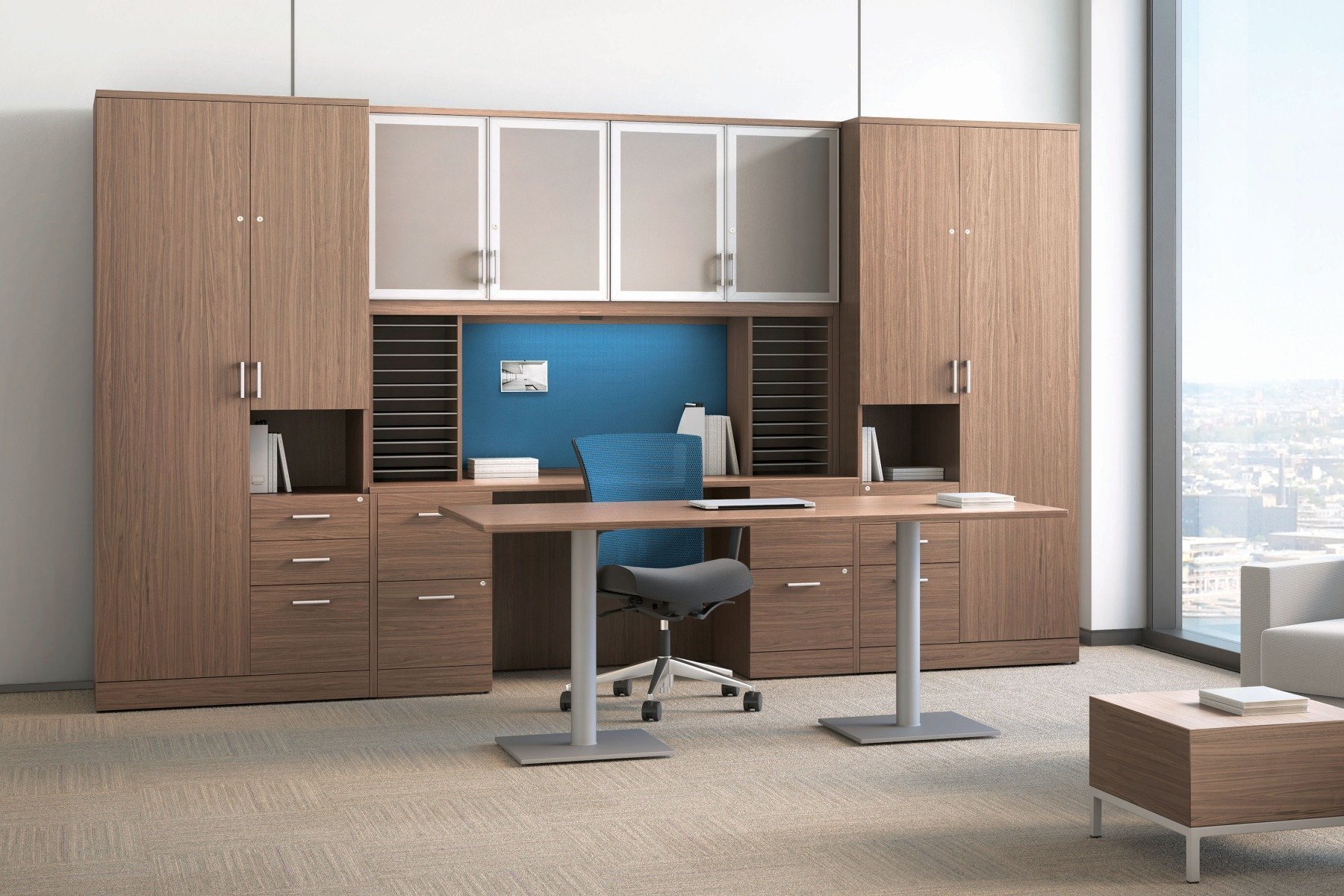 Les centaines d’éléments se trouvant dans la gamme de mobilier Zira permettent de personnaliser intelligemment la disposition de tout poste de travail exécutif. Cela inclut la conception de solutions de rangement optimales et l’organisation d’espaces spécifiquement adaptés pour le travail à l’ordinateur.